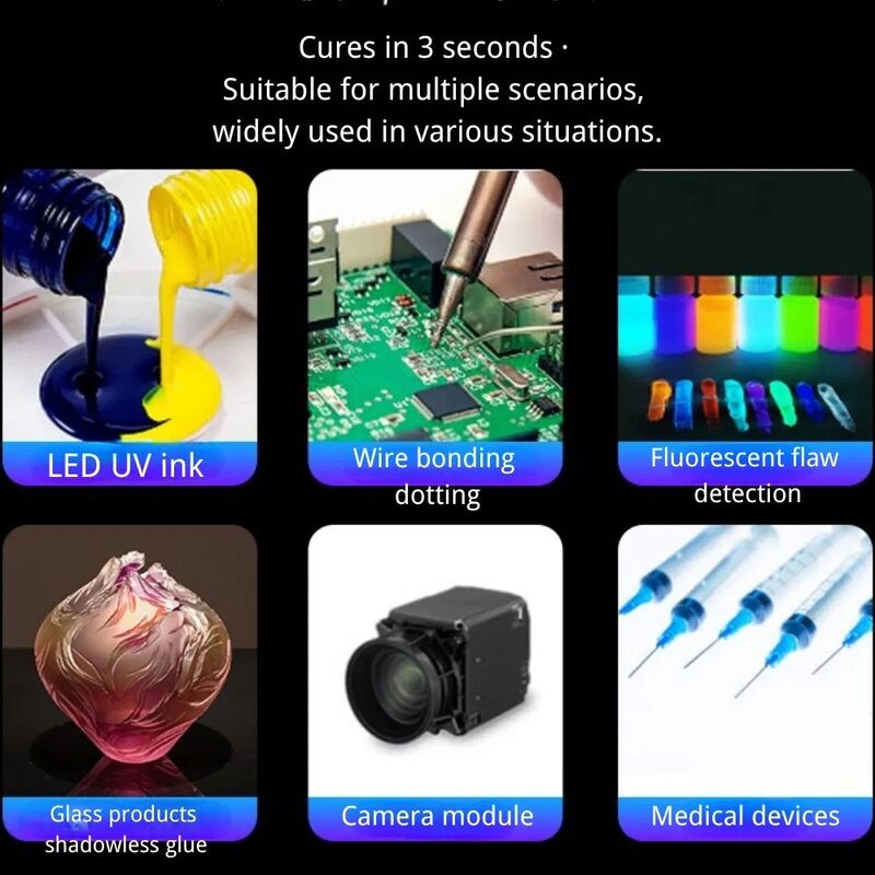 - Multi-longitud de onda: 365NM (electrónica), 395NM (unión acrílica), 405NM (resina de impresión 3D)